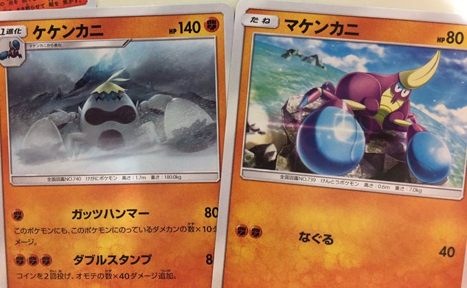 ポケモン カードゲーム マケンカニ 053 / 095 No739 けんとうポケモン 高さ:06 m 重さ:7 kg 硬い ハサミは 攻めも 守りも 得意。 進化 ケケンカニ1 1 回答 ポケモンsmでマケンカニを ポケモンsmでマケンカニを 使っているのですが44レベルになっても 進化しません。 進化方法分かる方いたら教えて下さい! 続きを読む逃げた場合はマケンカニも残る。 アニメにおけるマケンカニ sm編第10話でハラのポケモンとして初登場した。sm編第60話でラナキラマウンテンに連れてこられ、ケケンカニに進化した。 ポケモンカードにおけるマケンカニ マケンカニ (カードゲーム)を参照。達成方法:ポケモン図鑑の「